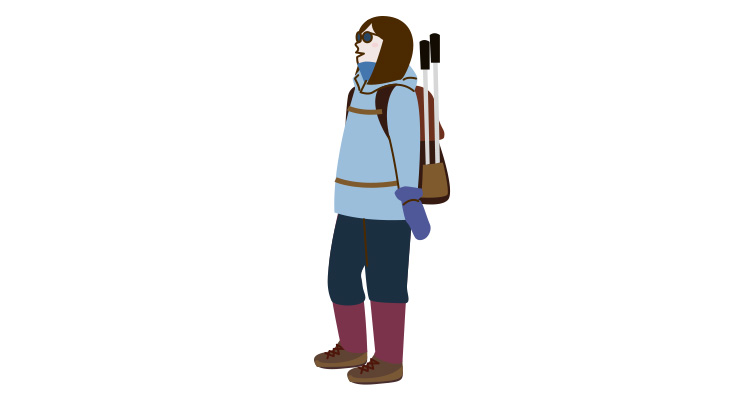 ダウンジャケット、セーター、手袋、ニットキャップ、厚手の靴下、ブーツなど ※すみずみまで防寒をしっかりと