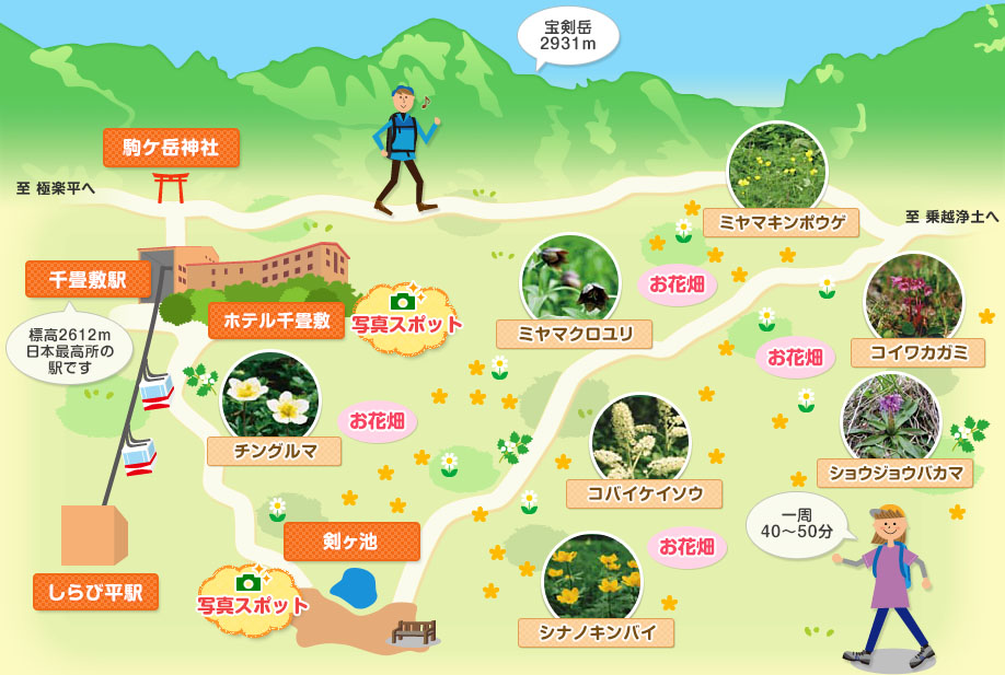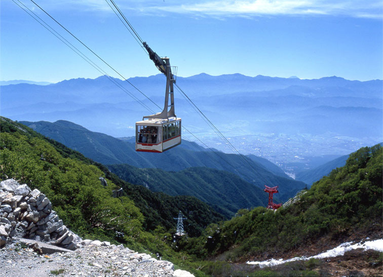 中央アルプス宝剣岳(標高2,931m)直下の通称「千畳敷カール」まで架けられた、日本で最初の山岳ロープウェイです。昭和42年完成、平成10年11月1日にリニューアルオープンしました。しらび平駅~千畳敷駅までの高低差は950m、終点の千畳敷駅は標高2,612mにあり、いずれも日本最高となっております。中央アルプスの主峰駒ヶ岳や南アルプス連峰、御岳山、乗鞍岳、北アルプスを一望でき、また、高山植物の宝庫としても有名です。