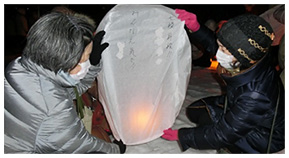 新潟の津南町では2012年から、震災復興の願いをこめて、毎年雪まつりのなかでランタン打ち上げを行っています。