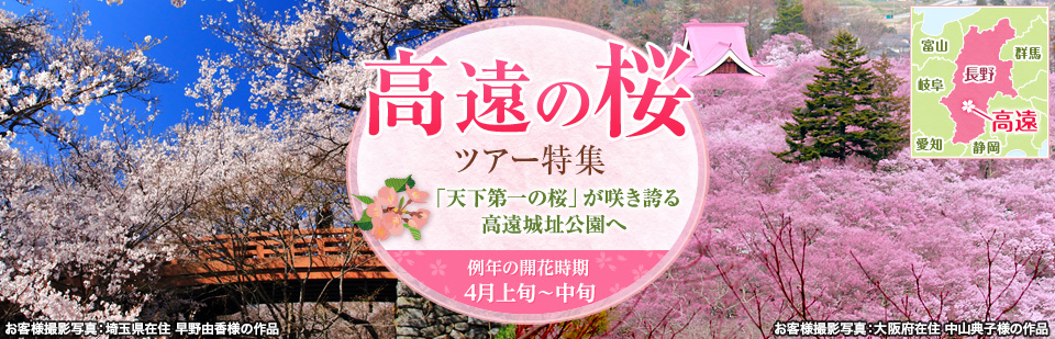 クラブツーリズムの高遠の桜を楽しむツアー・旅行なら、添乗員やスタッフがしっかりサポート。日本さくら100選に選ばれた信州 長野の高遠城址公園でコヒガンザクラ、さくら祭りを楽しむツアーなどをご紹介。ツアー検索・ご予約も簡単です。