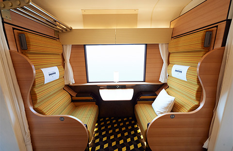 夜行列車として運転する場合は1つのボックスにつき1名様でのご利用となります。お休みの際は、可動式の背もたれを倒すことでベッド状に転換することができます。