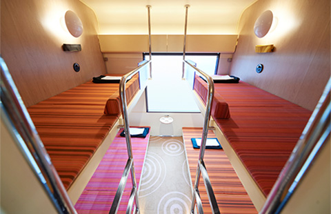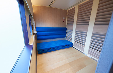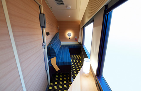 車窓に対して斜めに配置されたベンチ型の座席からは、ワイドでダイナミックな風景がお楽しみいただけます。お休みの際は、可動式の背もたれを倒すことでベッド状に転換することができます。