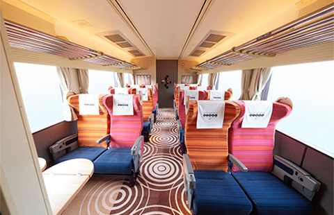 一般的な特急列車の座席よりも前後の間隔を広くしたほか、リクライニング角度も深くなっており、長距離のご旅行でもゆったりとお過ごしいただけます。2号車の女性席は明るいカラーリングとしたほか、座席が互い違いに配置されているのも特徴です。