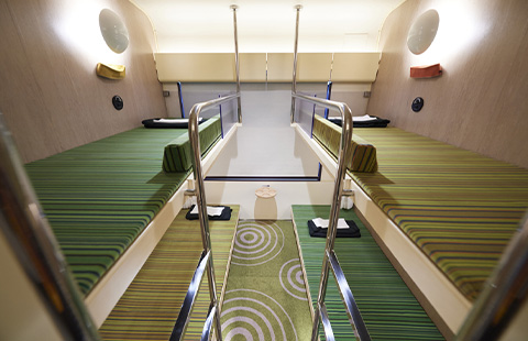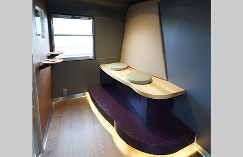ひとつのボックスに上下2段の計4席が設置されており、グループでのご利用にもおすすめです。座席ごとに、個別の照明や倉敷帆布の小物入れを設置するなどの過ごしやすい工夫も。