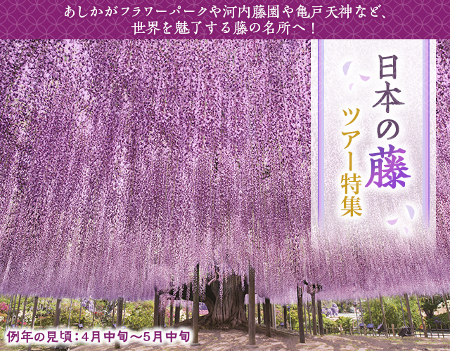 クラブツーリズムが、あしかがフラワーパークの藤、河内藤園の藤、亀戸天神社の藤まつりなど、藤の花を満喫できるツアー・旅行をご紹介!添乗員付きならしっかりサポート。ツアーの検索・ご予約も簡単。
