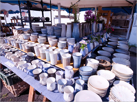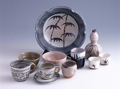 1853(嘉永6)年に笠間の陶工により開かれ、この時陶技を学んだ大塚啓三郎が根古屋に窯を築き、陶業を開始したのが益子焼の始まりとされています。民芸派の巨匠陶芸家・濱田庄司が、益子に工房を構えて制作をはじめたことで広く浸透しました。素朴な美しさと温かな手触りが特徴的です。春と秋の大陶器市が有名で、関東各県より35~40万人の人出で賑わいます。