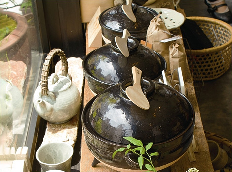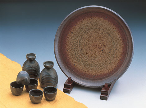 伊賀焼は天平頃、阿山郡丸柱村に起こったと考えられており、耐火度の強い土の特性を活かした行平鍋、土鍋、土瓶、蒸し鍋など耐熱食器制作の技術は現在まで受け継がれています。代表するものとして「破袋水差」「耳付花入」。大きな小石混じりの土で焼成されており、透明な萌黄色または白萌黄色の釉薬となり偶然の美ともいえる色調をもたらします。
