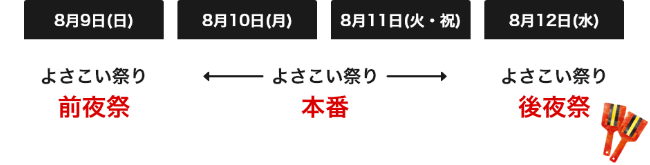 不景気風を吹き飛ばし市民を元気づけようと行われたのが祭りの始まりとされています。よさこい発祥の地である高知市では、毎年8月10日・11日のよさこい祭り本番に約190チーム、約2万人の踊り子が参加します。個性溢れる衣装や音楽、振り付けで、高知市内の各競演場や演舞場で熱気溢れる踊りを披露します。8月9日には、よさこい祭り前夜祭と土佐学生よさこい大会、12日にはよさこい祭り後夜祭とよさこい全国大会が開催されています。