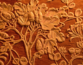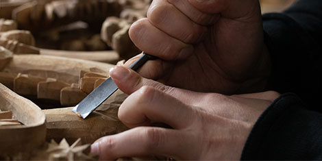 江戸中期の大火で焼失した真宗大谷派の井波別院 瑞泉寺を再建する際、東本願寺の御用彫刻師・前川三四郎に彫刻を依頼したのが物語の始まり。四人の地元大工が三四郎から技法を習い、瑞泉寺の再建などで培った技術と融合させることで、華麗で豪壮な井波彫刻が生まれました。この技術・技法は受け継がれ、やがて井波には彫刻師を目指す者が集まるようになります。