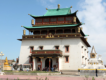 共産党支配の時代にも破壊を免れた寺院のひとつでモンゴルにおけるラマ教の中心です。ツォクチン(大講堂)ではラマ僧の朝の勤行を見学することも出来ます。