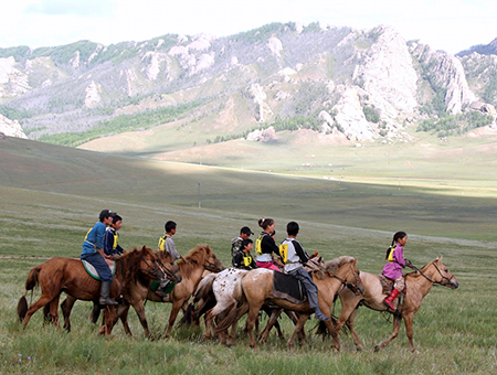 遊牧民の子供たちは乗馬が得意。馬は生活にかかせない生き物であり、小さな頃から馬と共に生活をしてきた子供たちは皆、乗馬が出来ます。馬に乗れないと移動も出来ない。そんな国なのです。モンゴルではいたるところで、こんなのどかな風景が見られます。