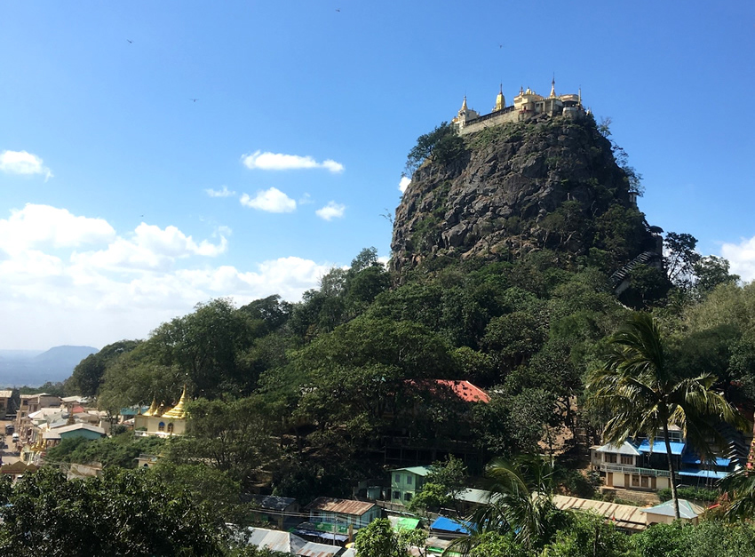 ミャンマーの土着の宗教であるナッ信仰の聖地ポッパ山はバガンから約50kmほど南東に位置しています。山の中腹のタウンカラッという岩峰には、寺院がそびえたち、不思議な雰囲気を醸し出しています。