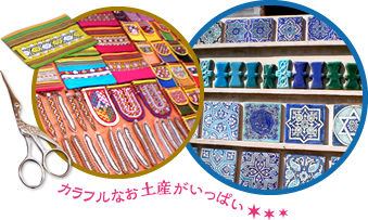 サマルカンドブルーと同じ青色や緑色の装飾が美しい陶器の小物や、 刺繍が施された布スザニ、木細工など、 多種多様でカラフルなお土産品がバザールを埋め尽くします。