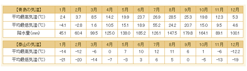 青島は日本と同じように四季があります。基本的には東京と同じような服装となりますが、冬は東京よりも底冷えする場合がございます。帽子やマフラーなどのご準備を忘れずに。また夏はバスや室内の冷房が効いていることも多いので、上着も常にお持ち下さい。