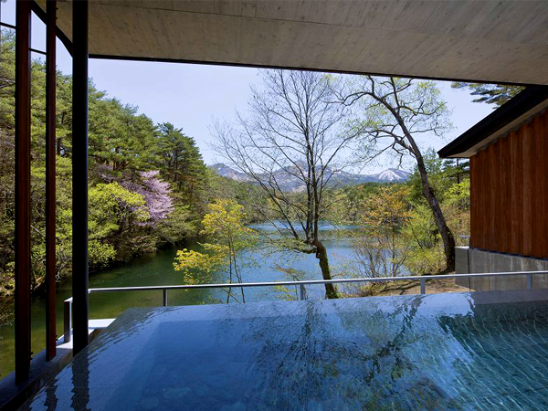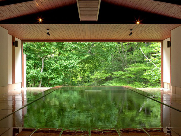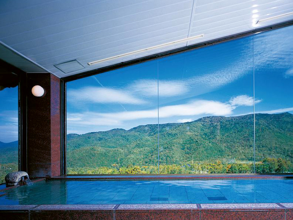 上信越国立公園の大自然の中に佇むホテルの大浴場からは奥志賀の山々を眺めることができ、