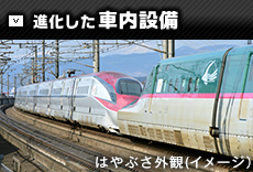 E5系は、最先端の技術を集結し、走行性能と信頼性、環境性能、快適性のすべてを高いレベルで融合させた新世代の新幹線車両です。座席は、普通車、グリーン車、グランクラスの3種類があります。車内設備としては、女性のお客さまの声を反映したトイレ・洗面所などの女性専用スペースを設置しているほか、大型フルカラーLEDを採用した情報案内装置、改良型ハンドル形電動車いすに対応した大型トイレや多目的室、客室とデッキ内の防犯カメラ設置など、セキュリティやユニバーサルデザインの視点からも車内設備を進化させています。