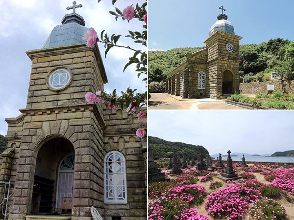 (写真左から時計回りに)頭ヶ島天主堂・頭ヶ島天主堂(提供:長崎県観光連盟)・頭ヶ島墓地 5月頃(提供:九州商船)※写真はすべてイメージです