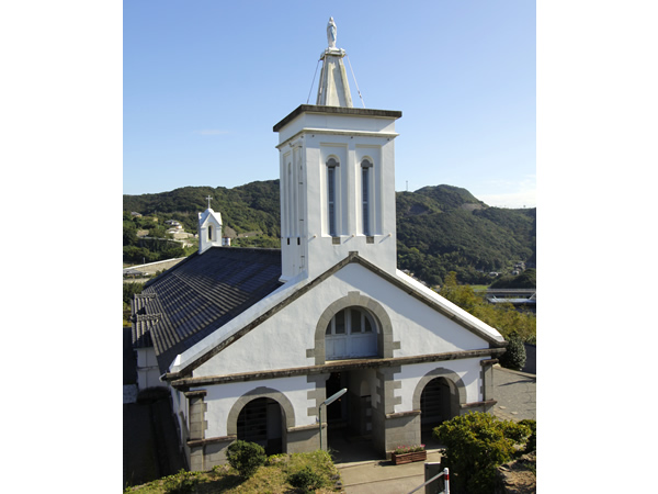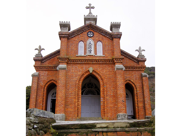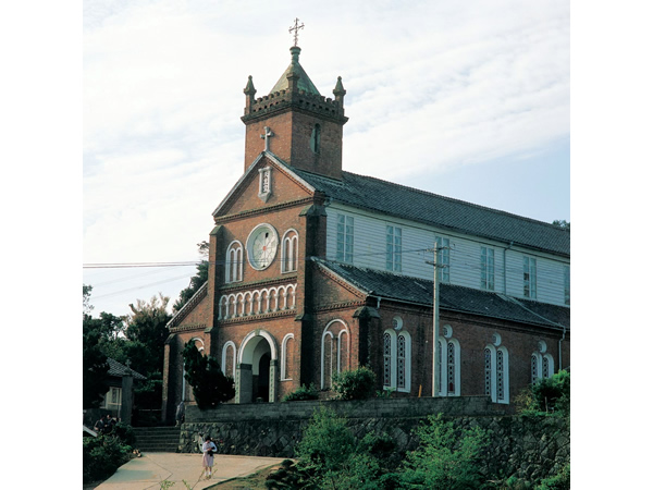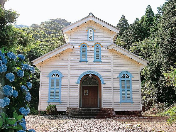 西日本で唯一、全国的にも珍しい石造りの教会で重圧的な概観とは対照に、内部には花柄の装飾が施されており、華やかな雰囲気が溢れています。完成までに10年かかりましたが、島の信者による資金集めや労働奉仕などの献身的な努力があったとされています。現在は国指定重要文化財に指定されています。
