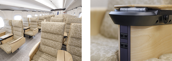 和洋折衷、クラシックとモダンが組み合わされた、懐かしくも新しい空間を表現。指定席は2-2列、自由席は3-2列の配席。指定席は号車毎に座席のデザインが異なります。