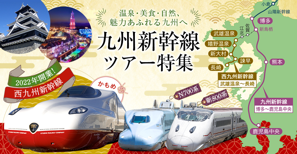 九州新幹線乗車ツアーをご紹介。博多-鹿児島中央間を走る九州新幹線に加え、武雄温泉-長崎間を走る西九州新幹線も2022年9月に開業。ますます魅力あふれる九州へ!のんびり温泉や各県の観光地など…九州へ旅行に行くなら九州新幹線に乗ろう。