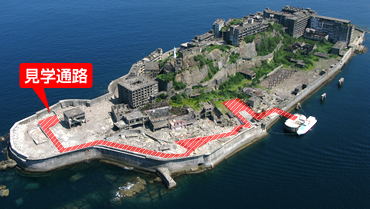 上陸ツアーでは、主力坑だった第二竪坑跡や、端島炭坑の中枢であったレンガ造りの総合事務所、1916年に建てられた日本最古の鉄筋コンクリート造の7階建て30号棟アパートなど赤い部分の見学通路(約220m)からご覧いただけます。
