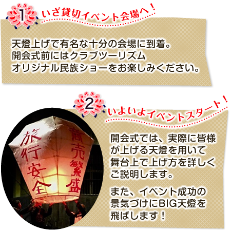 クラブツーリズム貸切会場で天燈上げを実際に体験していただけます。