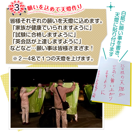 天燈上げイベントは荒天時の場合は中止となる可能性がございます。予めご了承ください。