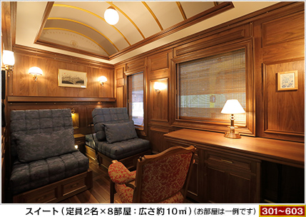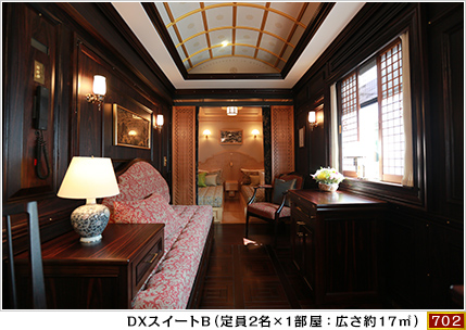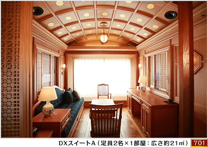 広々とした優美な空間には、和を感じる家具や調度品。DXスイートAのお部屋は、一面にほどこされた車窓からの景色をお楽しみいただけます。