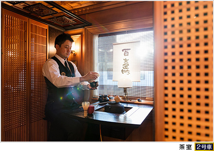 八女茶や知覧茶をはじめ、銘茶の産地としても知られる九州。車中に設けられた本格的な茶室で、各地の銘茶をお召し上がりいただけます。「ななつ星」クルーがお点前を差し上げます。