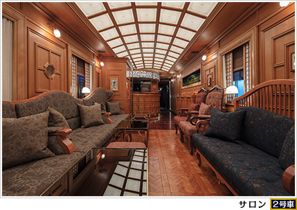 ジャパニーズモダンな雰囲気の中、乗車されたお客様との交流をお楽しみいただけます。寛ぎのソファに座って心地良い生演奏のピアノの音色に耳を傾けながら、展望用に大きく設けられた窓の外を見れば、流れ行く絶景が待っています。