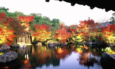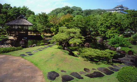 池や水の流れで結ばれた回遊式庭園で最大の特徴は「姫路城を借景」としているところであり、姫路城西の丸一帯の豊かな原生林を背にする庭園は、歴史と自然が調和した優美な景観を創り上げています。時代劇のロケ地としても使われているそうです。