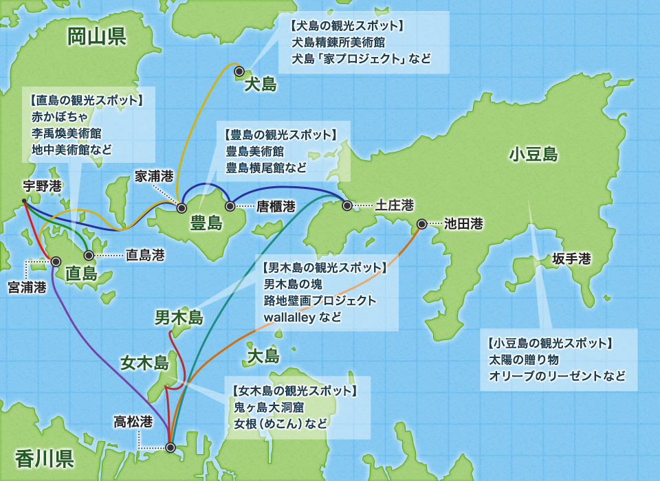 岡山県・宇野港よりフェリーで約20分、香川県・高松港よりフェリーで約50分(高速船で30分)