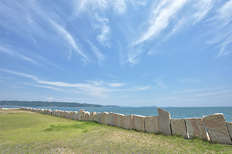 高松港からフェリーで約20分に位置する島。桃太郎伝説が残り、鬼が住んでいたといわれていることから別名「鬼ヶ島」とも呼ばれています。強風から家を守るために築かれた「オーテ」と呼ばれる石垣や、女木港の防波堤に約300羽のカモメが並ぶ木村崇人の作品「カモメの駐車場」など見どころが点在しています。