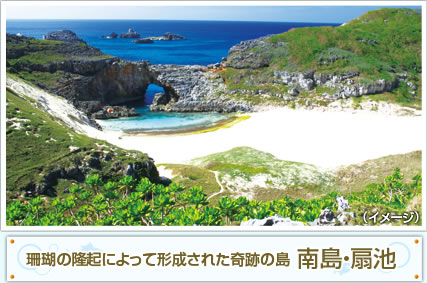南島は「沈水カルスト地形」という石灰岩特有の特殊な地形で「ドリーネ」というくぼ地や「ラピエ」という鋭くとがった岩が見られる父島南西沖の小さな無人島です。なかでも扇池は別世界に迷い込んだような美しさ。ここは多様な植生に加え海鳥やウミガメの産卵地であり、現在植生回復事業も行なっています。「適正な利用のルール」を守って大自然との遭遇を体験してください。