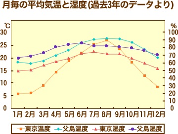 亜熱帯気候の小笠原は1年を通して暖かく、東京都内と比較しても降水量が少ないこともあり、過ごしやすいのが特徴です。毎年1月1日に日本一早い海開きが行われ、1年を通して海で泳ぐこともできます。年間平均気温23℃。1年中、日差しが強く日焼けするので日焼け対策は必須です。帽子やサングラス・日焼け止めなどをご用意ください。