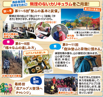 そんなあなたのための学べる登山ツアー(登山教室)を開講します。各回テーマを設けた登山ツアーで体力・知識を身につけ、来年には本格的な日本アルプス登山に挑戦します。あこがれの山を一緒にめざしましょう!