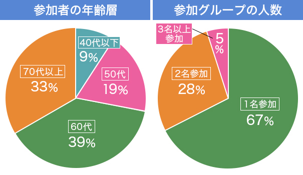 ・平均するとおひとり参加の方が6割以上と、はじめての方もお気軽にご参加いただけます。