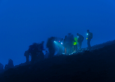 左:まだ暗い夜中から出発!ヘッドランプを忘れずに/右:登山者のヘッドランプの光の帯