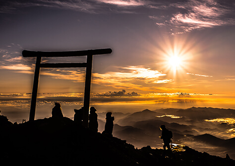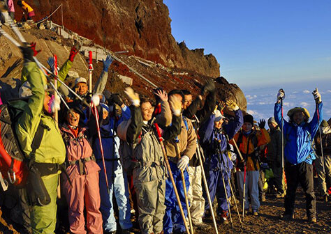 左:御来光の瞬間!感動はひとしおです!/右:一緒に感動を分かちあった旅仲間の表情は笑顔に満ちあふれています。