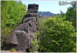 「吾妻山」の呼び名でも親しまれている四阿山の高原地帯には、様々な高原植物が生育しているほか、鳥居峠登山口から四阿山頂へと続く尾根上にある、「的岩」という珍しい景観に触れることができる。幅2~3m、高さ200mに及ぶ、ごつごつとした屏風状に見える柱状節理の岩肌に、2mほどの大きな穴があいており、国の天然記念物に指定されている。この穴は源頼朝が弓矢で射抜いたとの伝説が伝えられている。