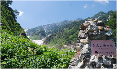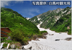 夏にはたくさんの登山客が集まる白馬岳。積雪と雪崩が重なって形を成す「白馬大雪渓」は、夏場でもひんやりと涼しい風を運んでくる。全長3.5km、標高差600mの大きさを誇り、そのスケールは日本一といわれている。登山口の猿倉から大雪渓までの、約1時間30分の道のりの白馬大雪渓遊歩道では、キヌガサソウやサンカヨウなどの高山植物が目を楽しませてくれる。