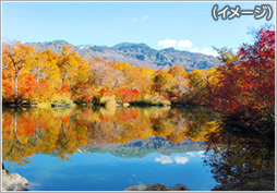 雨飾山の麓、標高1,190mにある鎌池。雨飾山への分岐点あたりから池畔へと続く鎌池ブナ小径を約2時間ほど行くと、やがて目の前に姿を現す。ブナ原生林に囲まれて佇む池の周りには、約2kmの遊歩道が整備されており、静かな散策が満喫できる。秋になると、池の周囲をふちどる色とりどりの紅葉と山肌が水面に映り込み、得も言われぬ美しさとなる。カメラマンにも人気のスポットだ。