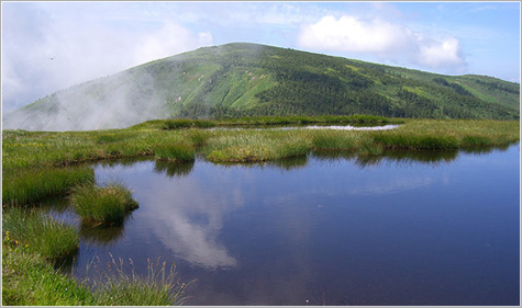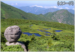 「日本百名山」の著者が、燧ヶ岳、至仏山、武尊山、会津駒ヶ岳などの百名山山頂からその長く平らな山容を望み、百名山に入れたいと思い続けたという平ヶ岳。日本海に注ぐ阿賀野川、太平洋を目指す利根川の源流域にあり、山頂付近は湿地で池塘が多く、チングルマ、ミツバノバイカオウレン、オノエランなどが白い可憐な花を咲かせる。また、池塘の中にカワモズクが生育しているという。