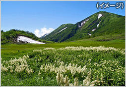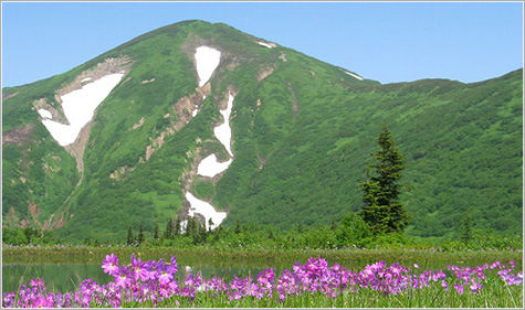長野県と新潟県の県境に連なる連峰「頸城山塊」のうち、最高峰とされるのがこの火打山。高山植物の宝庫といわれ、夏になると途中の「高谷池」周辺には数々の花が咲き乱れる。その先の「天狗の庭」一帯にはワタスゲの群落が広がり、その向こうに見える火打山とともに、素晴らしい景観を作り出し、高谷池と天狗の庭の間にもハクサンコザクラの群落を見ることができる。天狗の庭は、秋の紅葉も美しい。