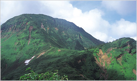 国道17号線で三国峠を越えるとまもなく苗場スキー場、貝掛温泉。さらに下ると、三俣、越後湯沢になる。幕末の越後塩沢の随筆家で『北越雪譜』を表した鈴木牧之は、湯沢から登り始め、三俣から苗場山を目指したという。山頂は平坦な湿地でまさに苗場だったと記し、この山を「越後第一の高山」と紹介した。夏には6合目から山頂にかけて、ゴゼンタチバナやチングルマ、シラネアオイ、ワタスゲなどたくさんの高山植物が咲き乱れる。