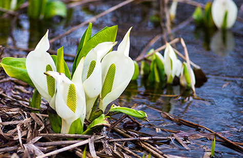 例年5月~6月が見ごろ。ポスターや雑誌などでも紹介される下ノ大川沿いの水芭蕉の群落。