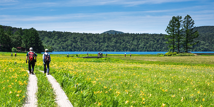 2007年8月、国内では20年振りに29番目となる国立公園として、尾瀬国立公園が誕生。群馬県・福島県・新潟県にまたがる広大な面積を誇る尾瀬ヶ原周辺は初夏を迎えるとミズバショウなどの花々が咲き、夏にはニッコウキスゲなど、そして秋には一面黄金色に広がる草紅葉など、尾瀬は四季を通じてさまざまな風景に変わります。さわやかな風を感じながら、尾瀬ならではのハイキングを楽しみましょう!