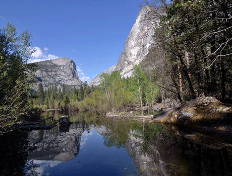 鏡のように静かな湖面に、ヨセミテの雄大な山々が映り込む幻想的な風景を目指すハイキングへ!