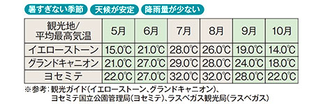 グランドサークルを含むアメリカ西部国立公園のハイキングは、暑い夏場を避けるのがベスト!春(5~6月)や秋(9~10月)は夏に比べて気温も高すぎず、歩きに適したシーズンです。1年の中で降雨量が少なく天候が安定しているのも特徴です。