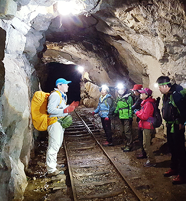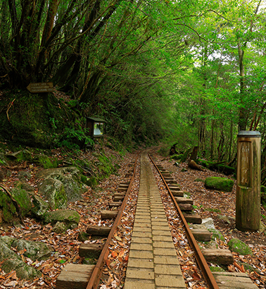 縄文杉トレッキングの全行程(片道約11km)のうち、約9kmはトロッコ軌道を歩く。このトンネル内も、枕木に注意しながら歩く。トンネル内に照明もあるが、早朝のうちに歩き始める場合は、ヘッドランプがあると安心。
